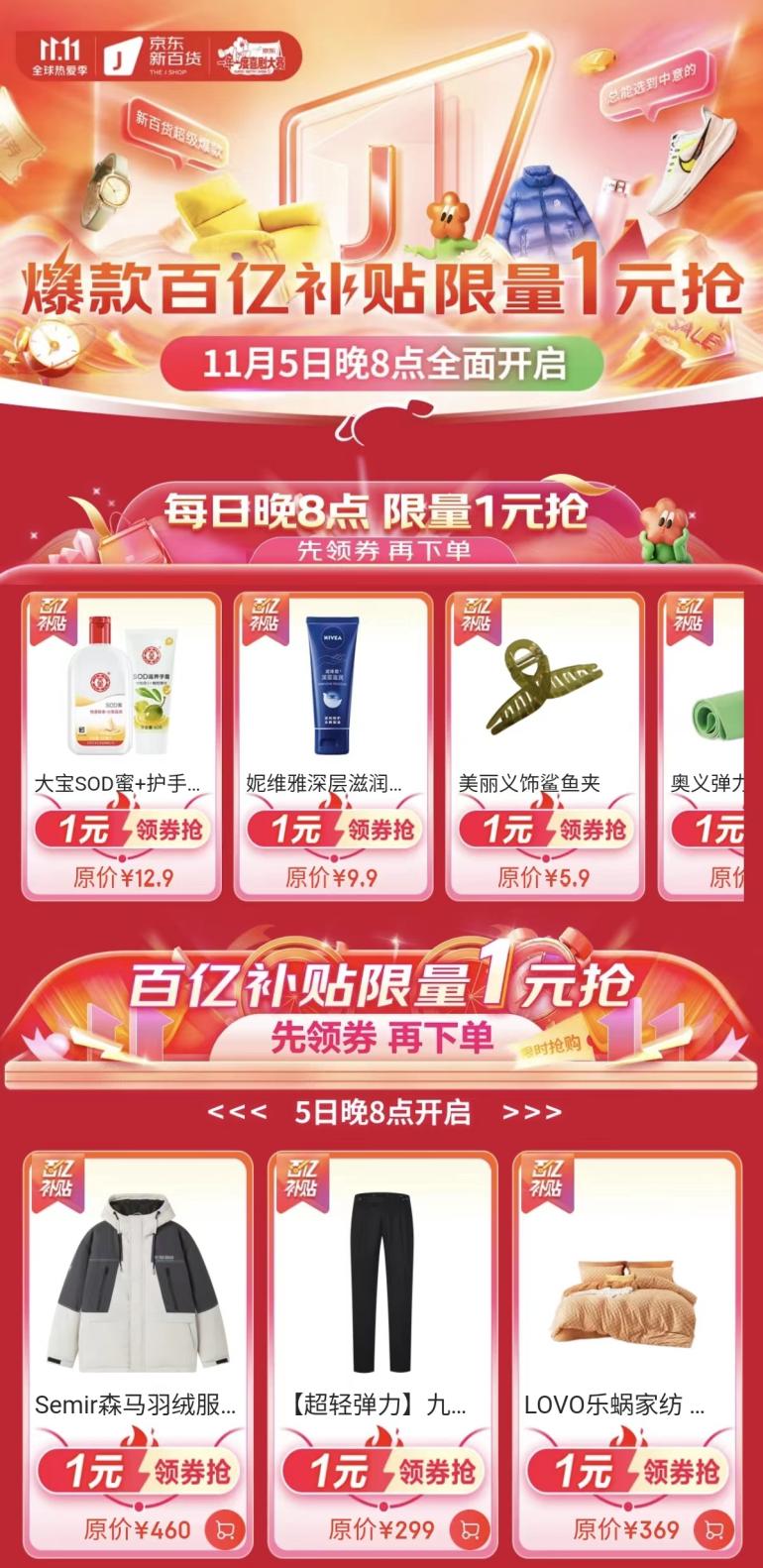 速途網11月5日訊(報道:喬志斌)今日,晚8點,京東新百貨主推日正式開啟,“爆款百億補貼限量1元搶”活動再度來襲。京東新百貨攜時尚服飾、品質居家、美妝護膚、運動戶外、奢品鐘表五大品類,以實在商品、實在價格、實在服務為消費者打造美好生活。無印良品羽絨背心、七匹狼牛仔褲、芝華仕頭等艙、林氏家居雙人床、資生堂精華、蘭芝面膜、鴻星爾克運動鞋、探路者羽絨服、羅西尼石英女表等高價值單品,全部限量1元搶!