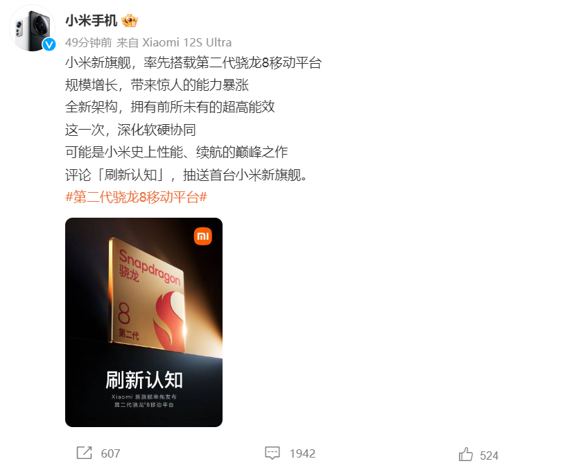 小米手機官方微博也發布了“刷新認知”的主題海報,并表示新一代旗艦機“可能是小米史上性能、續航的巔峰之作”。