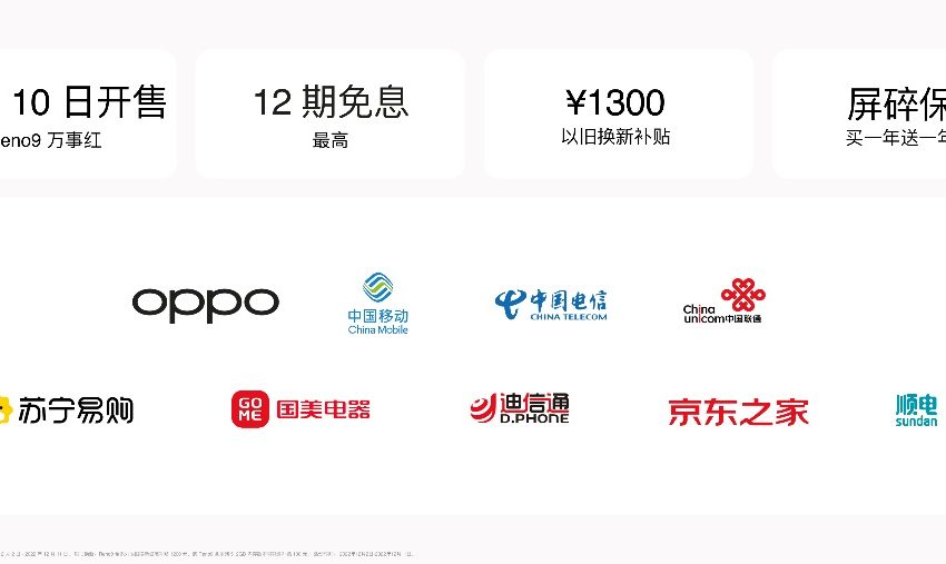 新品即日起接受預(yù)定,并將于12月2日上午10點(diǎn)在OPPO商城以及京東、天貓、蘇寧、抖音等線上渠道全面開(kāi)售,首銷期間可享受最高24期免息。同時(shí),OPPO體驗(yàn)店、三大運(yùn)營(yíng)商合作廳、蘇寧、國(guó)美、迪信通、順電等線下賣場(chǎng)將同步開(kāi)售,首銷期間可享受最高12期免息。12月11日前,在線下購(gòu)買的用戶可獲得最高1300元以舊換新補(bǔ)貼,購(gòu)買1年碎屏保將額外贈(zèng)送一年有效期。此外,即日起至2022年12月4日,預(yù)訂Reno9系列16GB+512GB版本的用戶,將有機(jī)會(huì)參與大內(nèi)存免單計(jì)劃。