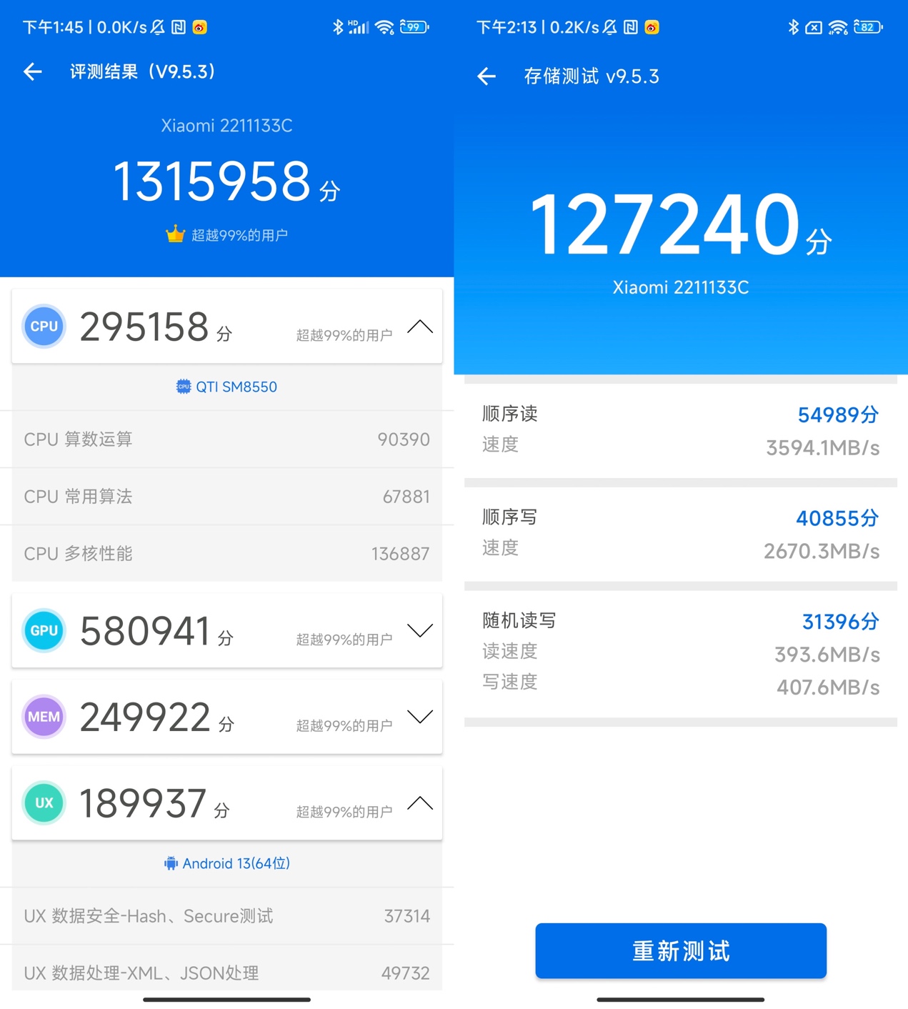 在安兔兔綜合跑分的測試中,小米13更是一舉跑出了1315958的高分。不僅如此,小米13還采用了采用全新LPDDR 5X內存,峰值頻率達到了8553kbps,256G/512G容量版本的機型還采用了UFS4.0閃存,實測順序讀寫速度分別為3594.1MB/s、2670.3MB/s。
