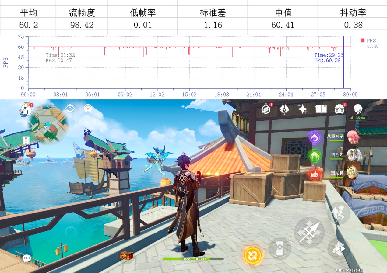 而在更加追求性能的《原神》的測試中,先將游戲內畫面設置調為“極高”,再手動將幀率調整到60FPS的模式,在30分鐘測試過程中,小米13的流暢表現給人留下的深刻的印象,不僅平均幀率達到了60.2FPS,游戲中幾乎全程幀率都保持在60FPS以上,且從未出現發熱降頻現象。