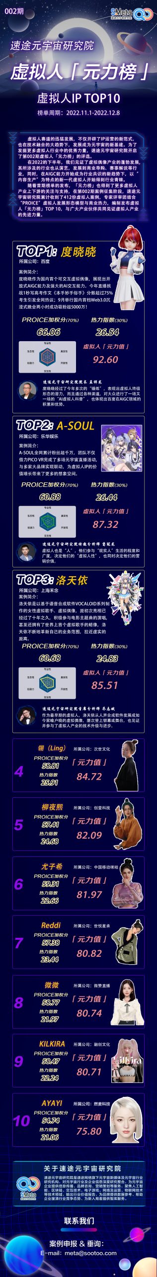 經(jīng)過為期一個月的案例征集,速途元宇宙研究院收到了412份虛擬人案例,通過一周時間的專家團評審階段,結(jié)合“PROICE”虛擬人評估模型與商業(yè)熱力,速途元宇宙研究院正式發(fā)布虛擬人「元力榜」TOP 10。
