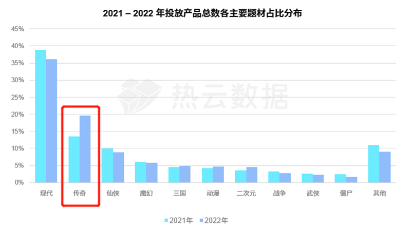 品類買量層面,角色扮演、休閑益智以及網(wǎng)賺類為代表的頭部買量優(yōu)勢依舊明顯。與去年相比今年中重度游戲在新游買量的表現(xiàn)有所突破,包括動(dòng)作、卡牌、角色扮演、SLG 等均進(jìn)入到了新增率 Top 10。其中,動(dòng)作類游戲躍升幅度最大,超過放置、網(wǎng)賺類等成為了 2022 年手游類型新增率第一,買量競爭熱度加劇。題材買量層面,現(xiàn)代題材投放熱度最高且傳奇題材占比提升較快,但整體上看,頭部手游題材買量排名與去年相比未發(fā)生變化。