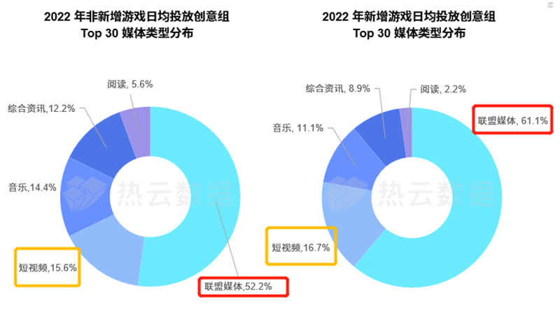 《青青草原》拔得2022新增游戲日均投放創(chuàng)意組頭籌,而舊游的日均投放榜一為《捕魚大咖》。網(wǎng)賺類游戲在兩個(gè)榜單中,分別上榜的數(shù)量最多。從新\舊投放Top 30 的手游類型分布對比上看,舊游中角色扮演游戲上榜數(shù)量相對較多,而新游中則更“輕度化”,休閑益智類游戲相對占優(yōu)優(yōu)勢。新舊榜單的投放媒體類型對比層面,聯(lián)盟媒體(如穿山甲、優(yōu)量匯等)投放熱度最高,投放占比均過半,其次為短視頻媒體平臺(tái)。