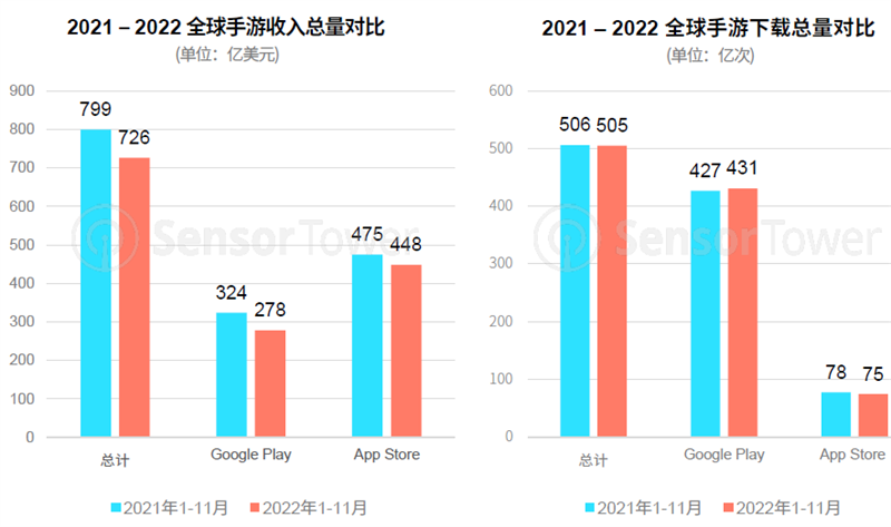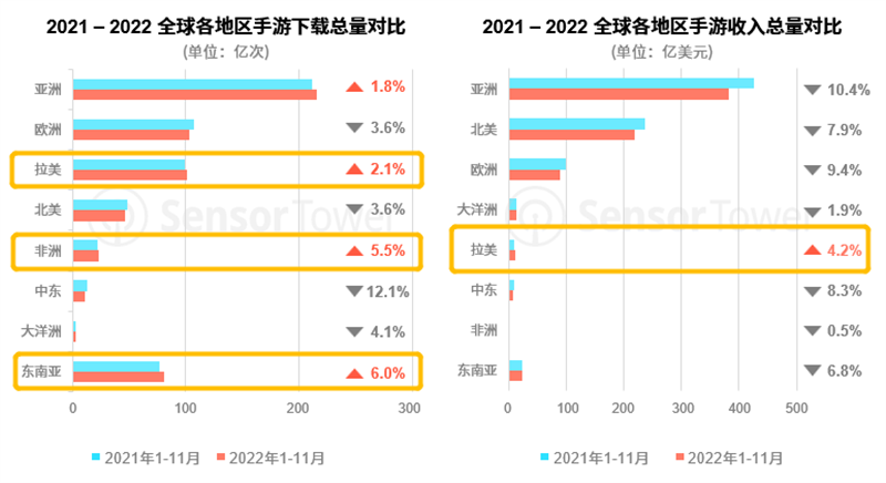 2022年全球移動(dòng)游戲市場呈“總體下行,局部穩(wěn)增”的態(tài)勢。全球手游市場收入總量同比下滑,是自新冠疫情爆發(fā)以來收入表現(xiàn)首次出現(xiàn)明顯下降的一年,大部分手游品類以及區(qū)域市場均出現(xiàn)負(fù)增長。在下載量層面,2022年總體下載量基本與去年保持持平,盡管歐美成熟市場出現(xiàn)不同程度負(fù)增長,但新興市場例如拉美、東南亞和非洲卻展示出樂觀的增長趨勢。