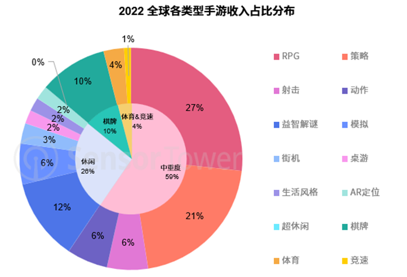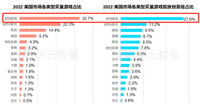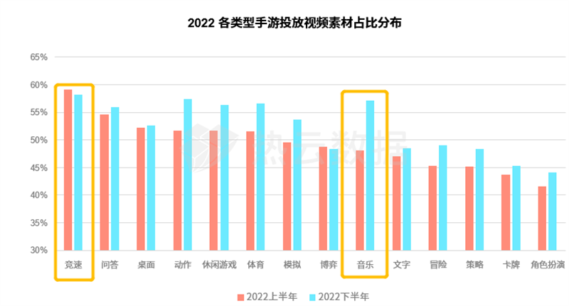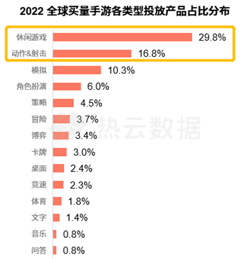 2022下半年,海外新增買量手游占比,雖較上半年下滑降至25%,但該數(shù)據(jù)仍居近3年的高位。休閑類游戲依舊是全球買量手游類型的 No.1,動(dòng)作 & 射擊類買量游戲數(shù)是今年占比排名上升最快的類型。此外,各類型手游加大視頻廣告投放占比,尤以競速游戲投放視頻廣告的占比領(lǐng)銜全品類,音樂類成為下半年視頻廣告占比提速最快的品類。