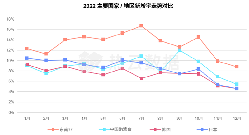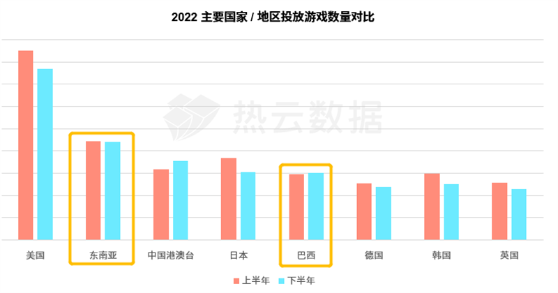 全球各重點(diǎn)買量市場中,全球大部分成熟手游買量市場,于2022下半年的買量手游數(shù)量同樣出現(xiàn)有不同程度的下滑;相反東南亞、巴西新興市場則穩(wěn)中有升,熱度不減。從增量上看,美國依舊是新增買量手游最高的國家;新興市場中的東南亞、巴西同樣表現(xiàn)搶眼。