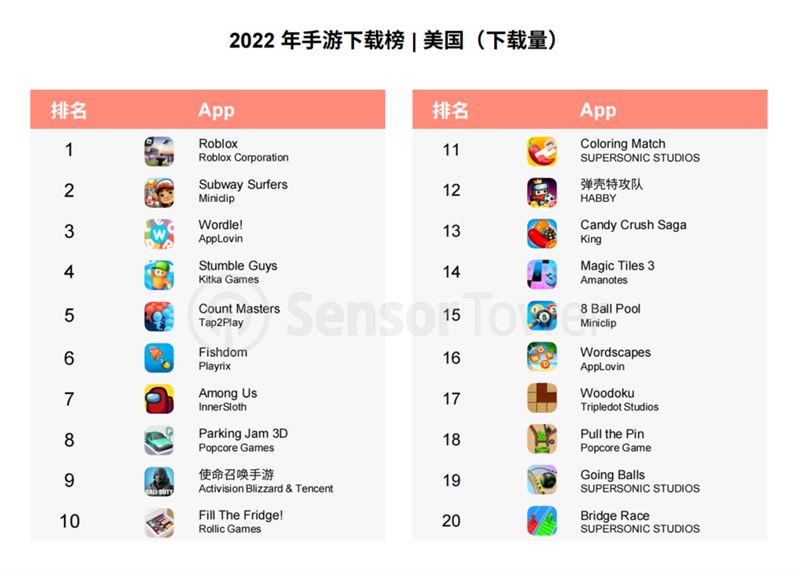 具體而言,以美國市場為例,該國的休閑類手游買量地位仍然牢固排名首位,且在單品的下載量以及收入的表現(xiàn)上依舊突出。 收入層面,經(jīng)典三消手游《Candy Crush Saga》依靠頻繁的關(guān)卡更新維持著穩(wěn)定的用戶活躍與營收,并在 2022 年超過《Roblox》重登美國暢銷榜榜首。而在 2022 年美國手游下載榜 Top 20 中,共 7 款為超休閑品類,可見該品類巨大的市場潛力。