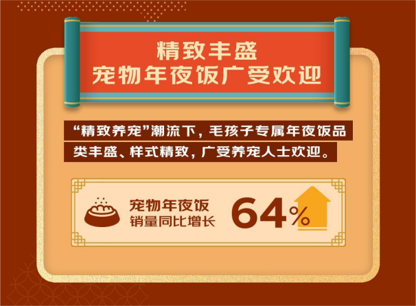 除夕將近,精致養(yǎng)寵的寵物主們也關(guān)注到了寵物年夜飯。根據(jù)報告,寵物年夜飯銷量同比增長64%,讓寵物也能感受除夕歡慶氣氛。