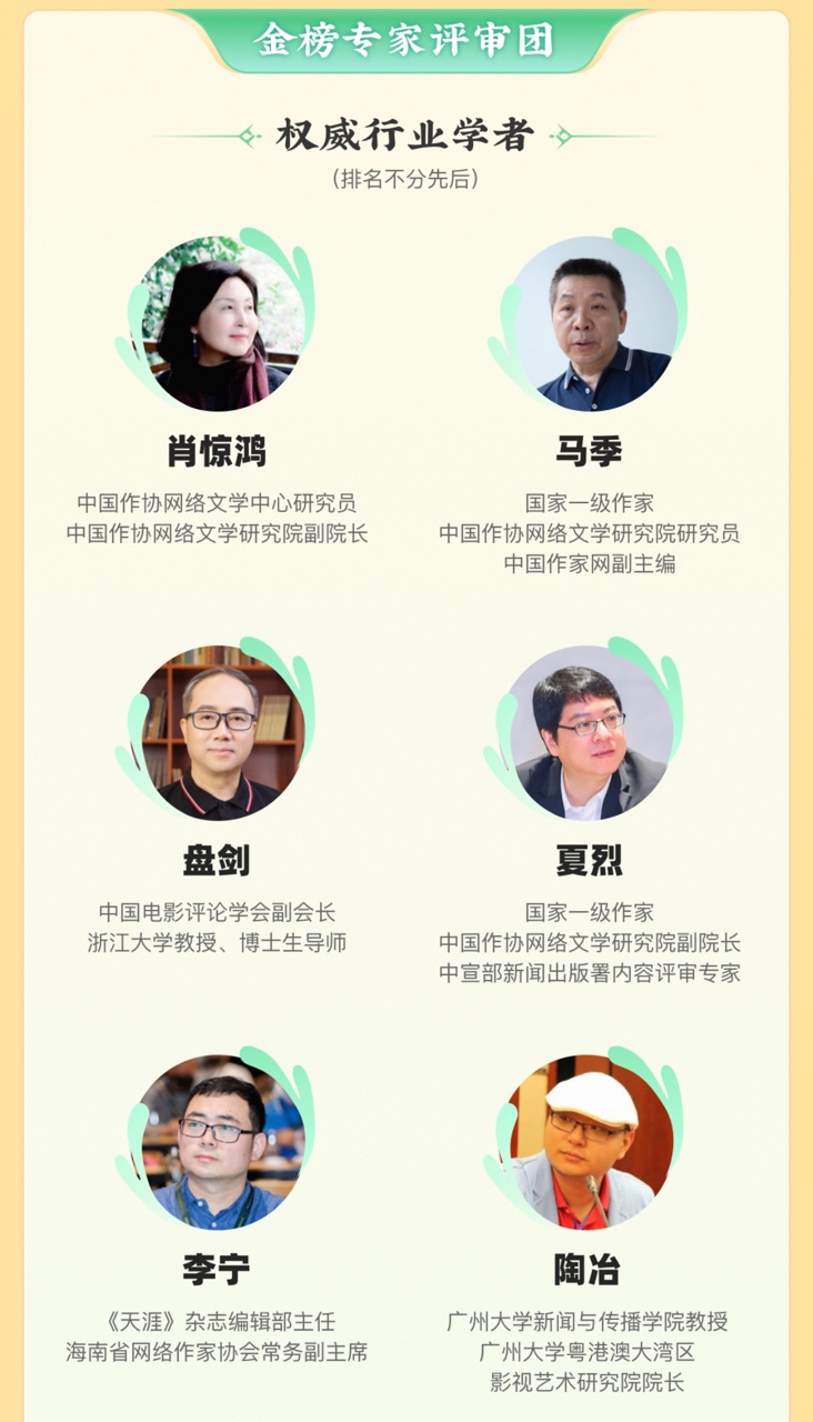 作為本次活動的合作方,中國網(wǎng)絡(luò)作家村將對本次評選進行全程指導(dǎo)和監(jiān)督,獲獎作品將由肖驚鴻、盤劍、夏烈、李寧、馬季、陶冶等專家及學(xué)者進行審核,此外管平潮、酒徒、靜夜寄思、月斜影清、 我本純潔、何常在、天下歸元、徐公子勝治、蔣離子等網(wǎng)文大神作者也會以評委身份進行點評和推薦。