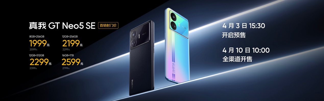 延續GT系列的旗艦基因,真我GT Neo5 SE以潮玩設計、越級性能、滿血續航、滿級內存再一次打動年輕消費者,將成為中端市場又一款競爭力拉滿的“黑馬神機”。 4月3日15:30,真我GT Neo5 SE在真我realme商城、京東、天貓等平臺正式開啟預售,首銷射門價8GB+256GB版本僅需1999元,12 GB +256GB版本2199元,12 GB +512GB版本2299元,16 GB +1TB版本2599元,其中8GB+256GB的版本將在京東平臺、真我realme官方商城開售。參與真我GT Neo5 SE預購可享受6期分期免息、30天無憂退換,并且贈送1年延保、1年碎屏保以及價值1400元的游戲禮包,4月10日全渠道正式開售。