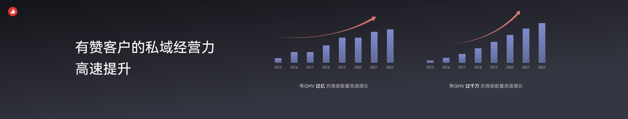 在2022年,有贊商家中私域成交額破億的商家數量相比2016年翻了6倍,年復合增長34.8%,而私域成交額超過千萬的商家數量相比2016年翻了17倍,年復合增長達到59.8%。這背后,是持續與有贊合作的商家通過私域積累下大量優質客戶資產,并借助有贊產品和服務,在連接、觸達、轉化和忠誠環節持續為用戶創造價值,通過精細化的私域經營,從而帶來了私域業績的不斷提升。