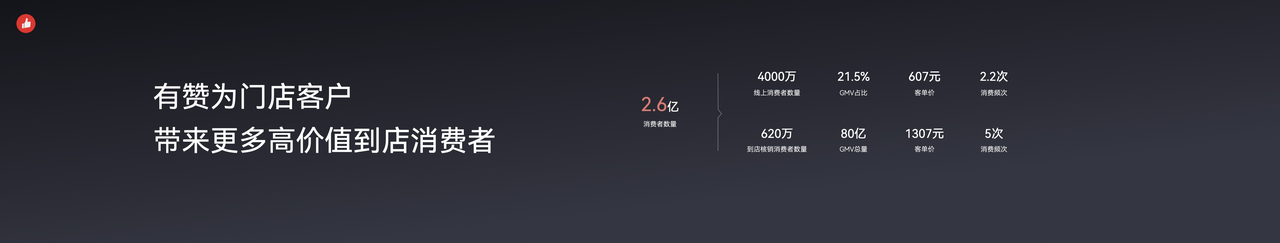 2022年有贊幫助門店商家有效連接了2.6億消費者,為門店帶來的線上用戶消費者數量達到4000萬,產生的交易額在門店商家整體GMV中占比達到21.5%,其中到店核銷的消費者人均貢獻的年消費額達到1307元,是純私域線上消費額的2倍以上,這驗證了有贊在公私域聯運上為商家帶來更多的價值創造。