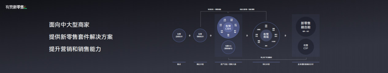 因此,面向中大型零售門店商家,圍繞“提升營銷能力和銷售能力”的目標,打造消費者運營解決方案。