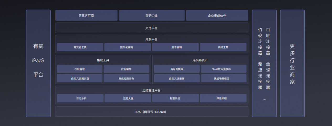 除此之外,有贊iPaaS基于有贊云生態,與眾多線下軟件廠商的行業能力進行了深度融合,目前已經集成了伯俊、百勝、南訊、鼎捷、金蝶、嘩啦啦等38個廠商的應用連接器。商家可以直接在有贊iPaaS平臺上訂購和使用,便可實現0代碼快速交付,無需再次開發,真正做到開箱即用。