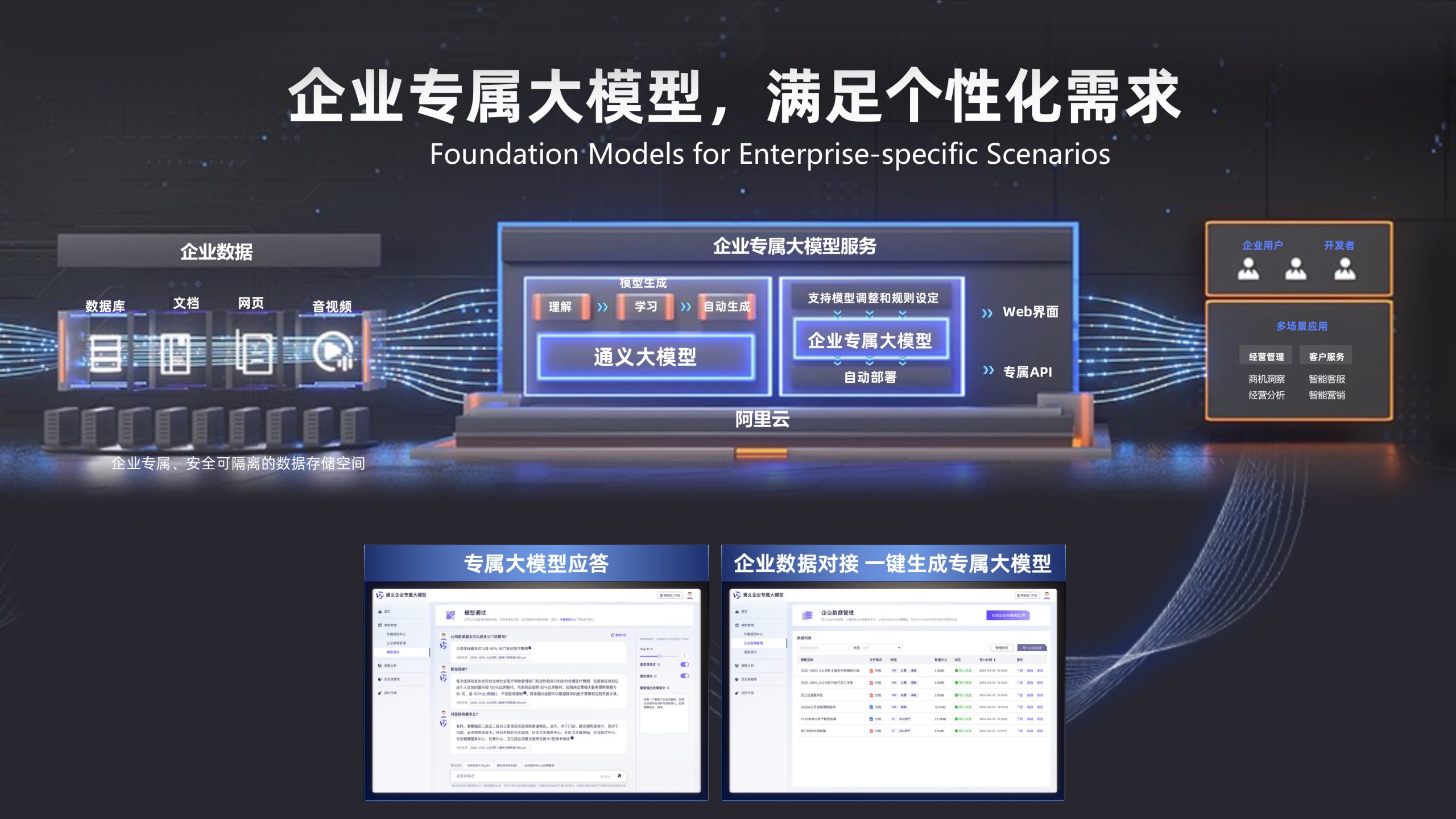 周靖人介紹,未來每一個企業在阿里云上既可以調用通義千問的全部能力,也可以結合企業自己的行業知識和應用場景,訓練自己的企業大模型。比如,每個企業都可以有自己的智能客服、智能導購、智能語音助手、文案助手、AI設計師、自動駕駛模型等。