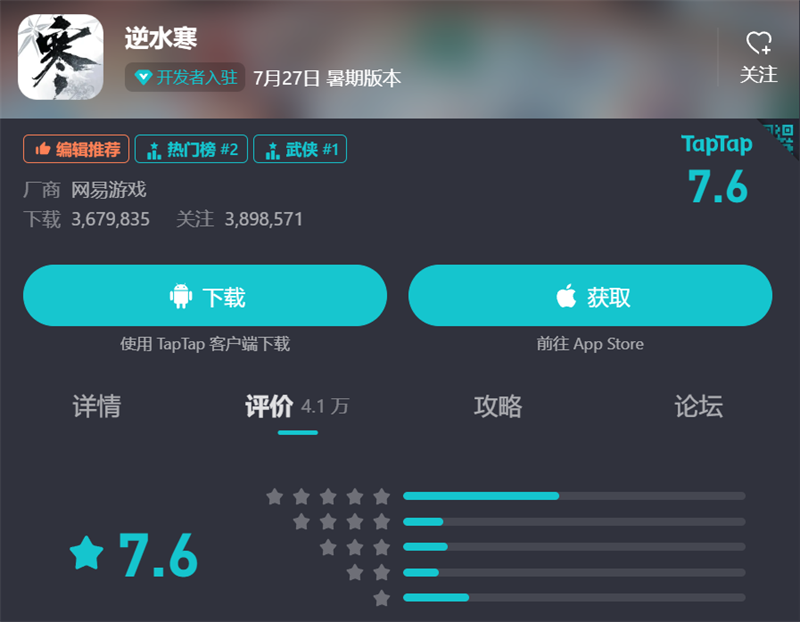 截至目前為止,《逆水寒》手游在超過(guò)4.1萬(wàn)玩家打分的情況下,仍能保持7.6分的高分——這是TapTap平臺(tái)上首月口碑最好的MMO游戲,沒有之一。