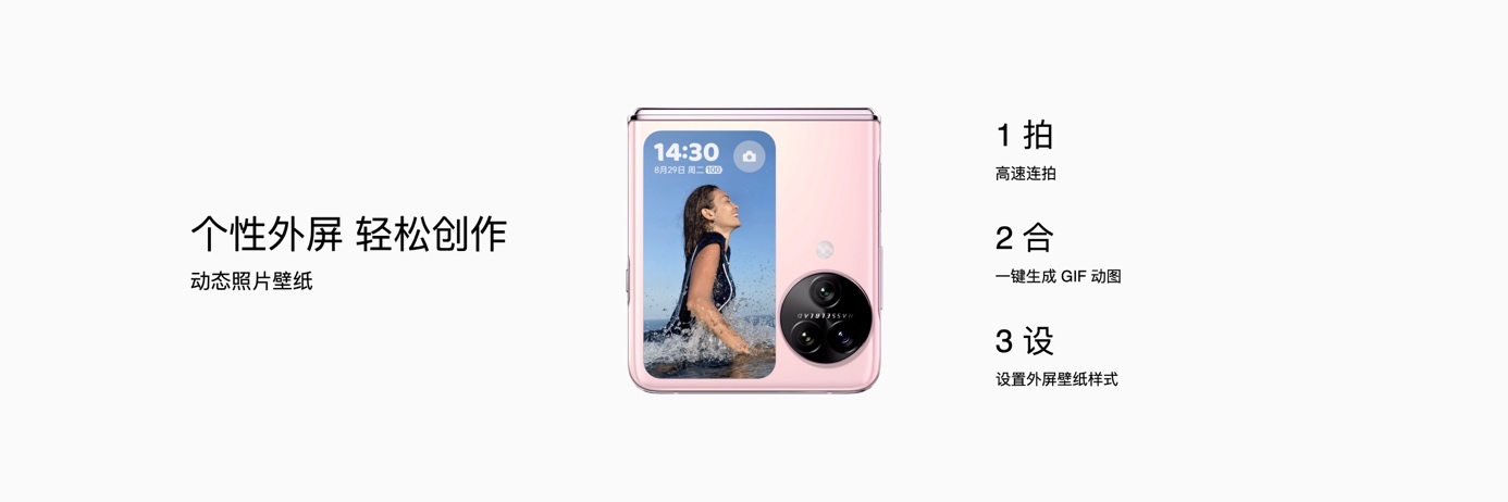 Find N3 Flip的個性化外屏還支持動態照片壁紙,通過高速連拍的一系列照片可以一鍵生成 GIF 動圖并設置為外屏壁紙,輕松創作更加獨一無二的外屏樣式。Find N3 Flip也是目前唯一支持任意窗全屏息屏顯示的折疊屏,即使不點擊屏幕,也可以快速查看重要信息,同時展現個性化的外屏設置。
