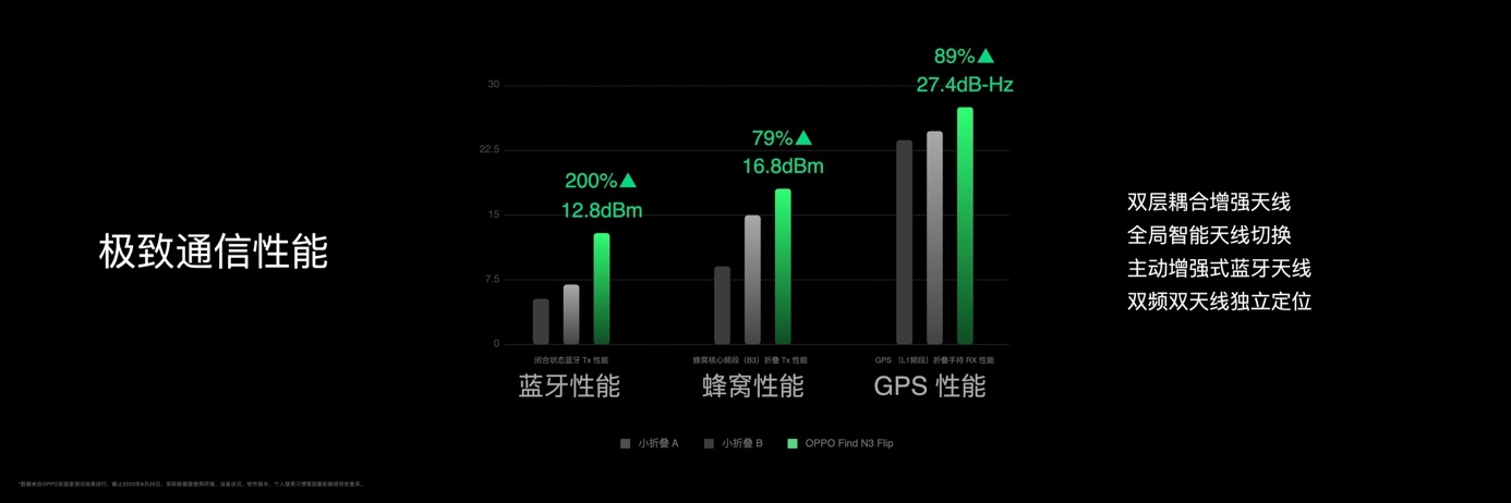 此外,Find N3 Flip搭載多項OPPO領先的通信技術,提供更可靠的連接體驗。相比其他小折疊產品,Find N3 Flip 支持雙層耦合增強天線、全局智能天線切換、主動增強式藍牙天線,以及雙頻雙天線獨立定位,實現藍牙、蜂窩與 GPS 性能的大幅提升。