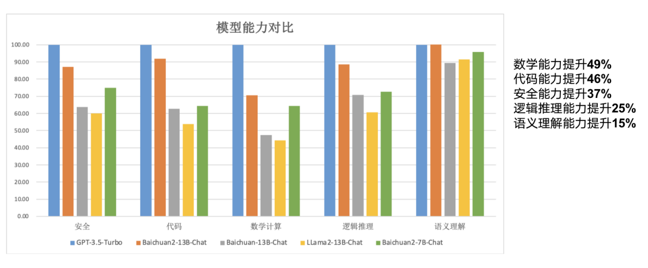 百川智能的Baichuan 2-7B-Base和Baichuan 2-13B-Base是基于2.6萬(wàn)億條高質(zhì)量多語(yǔ)言數(shù)據(jù)進(jìn)行訓(xùn)練的,它們?cè)诒A袅松弦淮_(kāi)源模型的出色生成與創(chuàng)作能力、流暢的多輪對(duì)話能力以及易用性等多個(gè)特點(diǎn)的基礎(chǔ)上,還在數(shù)學(xué)、編碼、安全、邏輯推理和語(yǔ)義理解等方面實(shí)現(xiàn)了顯著的提升。特別是Baichuan 2-13B-Base,相比上一代的13B模型,數(shù)學(xué)能力提高了49%,編碼能力提高了46%,安全能力提高了37%,邏輯推理能力提高了25%,語(yǔ)義理解能力提高了15%。