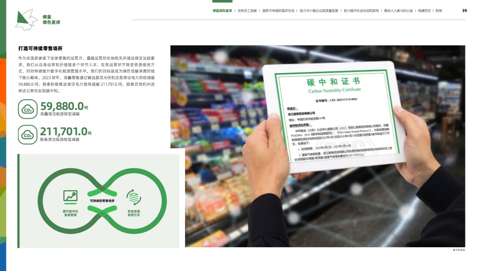 據阿里巴巴集團2023年ESG報告顯示,銀泰百貨2023財年使用清潔能源3億度,減碳超過21萬噸,37家門店獲評商務部“綠色商場”,其中銀泰百貨武林店已率先實現碳中和。銀泰百貨在投入節能改造、交易清潔電力、循環包裝方面持續探索,成為百貨行業綠色轉型的典范。