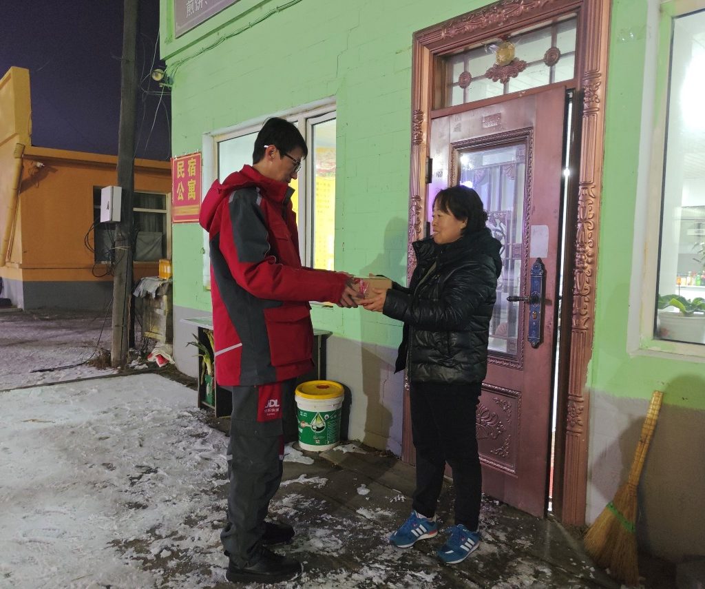 10月,黑龍江省大興安嶺地區漠河市迎來了今年第一場雪,如約而至的還有京東11.11的包裹。23日晚上,京東小哥尚祖峰穿過薄雪覆蓋的街道,叩響了姜女士的店門。今年京東11.11,姜女士在外地工作的兒子給她下單了最新款手機。第一時間收到寄托著兒子心意的包裹,姜女士表示:“我們這里冬天很長,路面結冰不好送,但京東快遞總是能第一時間送貨上門!”在這個北緯53°的中國最北城市,京東快遞小哥已經習慣常常驅車七、八十公里,為縣城周邊的村民送貨上門。尚祖峰會提前準備好暖寶寶為手機升溫,一天要多次往返站點為電三輪車充電。作為本地人,尚祖峰在京東快遞漠河營業部已工作五年,五年來,時效的提升、單量的翻番、配送范圍的擴大都讓他歷歷在目。