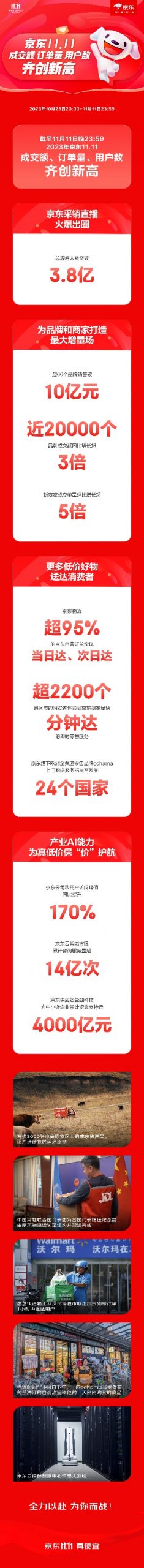 速途網(wǎng)11月12日訊(報道:喬志斌)截至11月11日晚23:59,2023年京東11.11成交額、訂單量、用戶數(shù)齊創(chuàng)新高,京東采銷直播火爆出圈,京東采銷直播的總觀看人數(shù)已突破3.8億。“9塊9包郵”、“京東百億補貼”、“京東秒殺”為品牌和商家打造了一個又一個增量場,目前累計超過60個品牌銷售破10億元,近20000個品牌成交額同比增長超3倍,新商家成交單量環(huán)比增長超5倍。