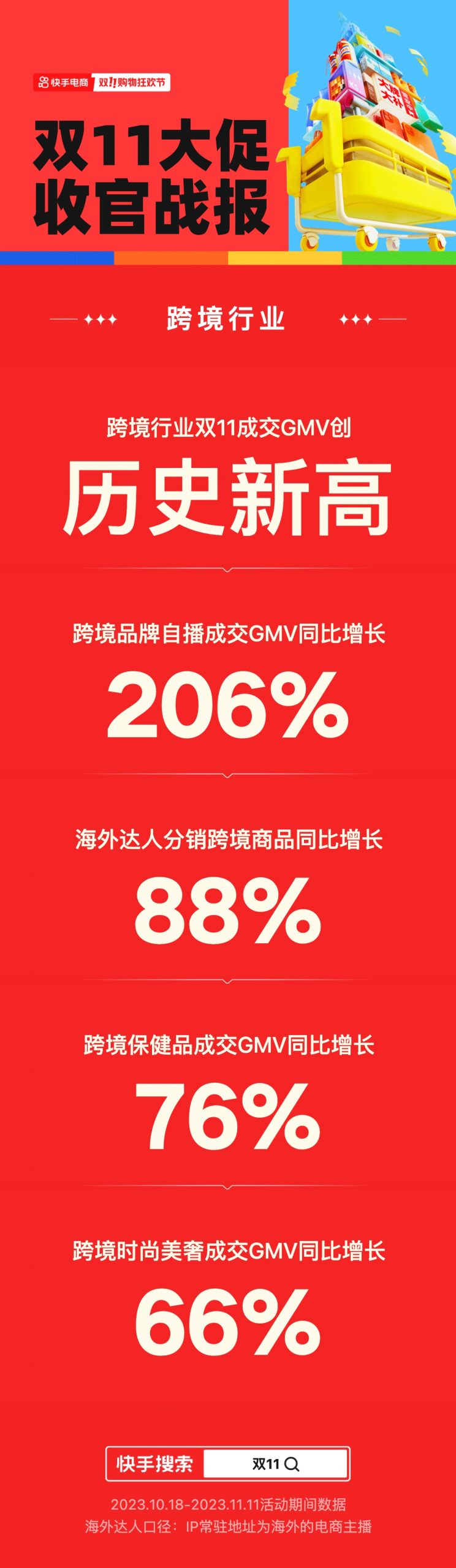速途網(wǎng)訊 雙11收官大捷。快手電商跨境行業(yè)雙11GMV創(chuàng)歷史新高,數(shù)據(jù)顯示(10月18日-11月11日),跨境品牌自播GMV同比提升206%,海外達人分銷跨境商品GMV同比提升88%,跨境保健品成交GMV同比提升76%,跨境時尚美奢品成交GMV同比提升66%。