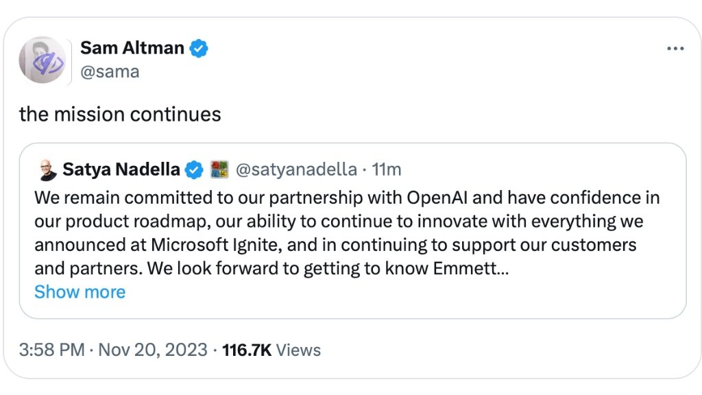 隨后,Sam Altman轉發該推文表示,the misson continues。