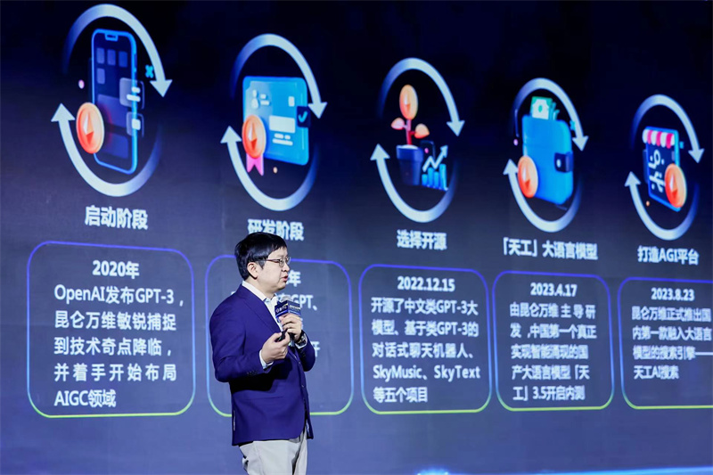 昆侖萬維今年發布了諸多包括天工AI搜索在內諸的AIGC產品,落地進展迅速。昆侖萬維董事長兼CEO方漢就分享了他們在AGI和AIGC上的探索之路, 從大模型再到 AI Agent開發平臺。