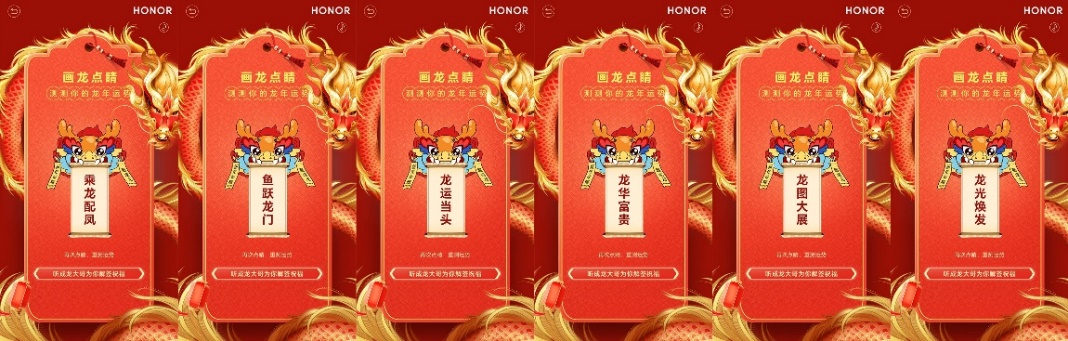 每到過年前后,大家都熱衷于立flag、許愿,求個新年好兆頭。榮耀攜手品牌龍年大使成龍上線“新年許愿處”活動,為消費者提供了可以和家人朋友一起玩起來、抽取“新年幸運簽”的活動新選項。消費者們到店只需掃碼進入到活動頁面,為龍頭點睛并隨機抽取“龍華富貴”、“龍運當頭”、“龍光煥發”、“龍圖大展”等龍年運勢簽,即可獲得成龍本人送上的新春語音祝福。不僅如此,榮耀還為消費者們準備了成龍專屬表情包和定制頭像,希望新的一年有buff加持,為消費者打開龍年好運,一起成龍!