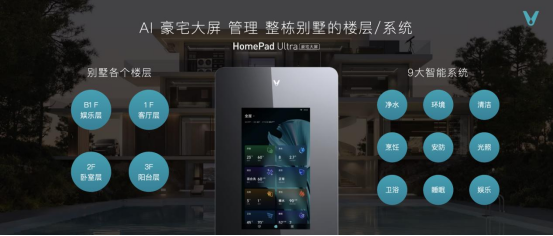 HomePad Ultra豪宅大屏適用于別墅的整棟控制,不僅完美搭配各式家居風格,還將全屋設備按系統分為凈水、環境、清潔、烹飪、安防、光照、衛浴、睡眠、娛樂9大類別,不僅可一鍵啟動對于各個樓層的設備控制,甚至實現車家互聯,一鍵開車庫、遠程遙控充電,省心又省力。攝像頭監控和AI異常實時處理功能,為居住安全保駕護航。