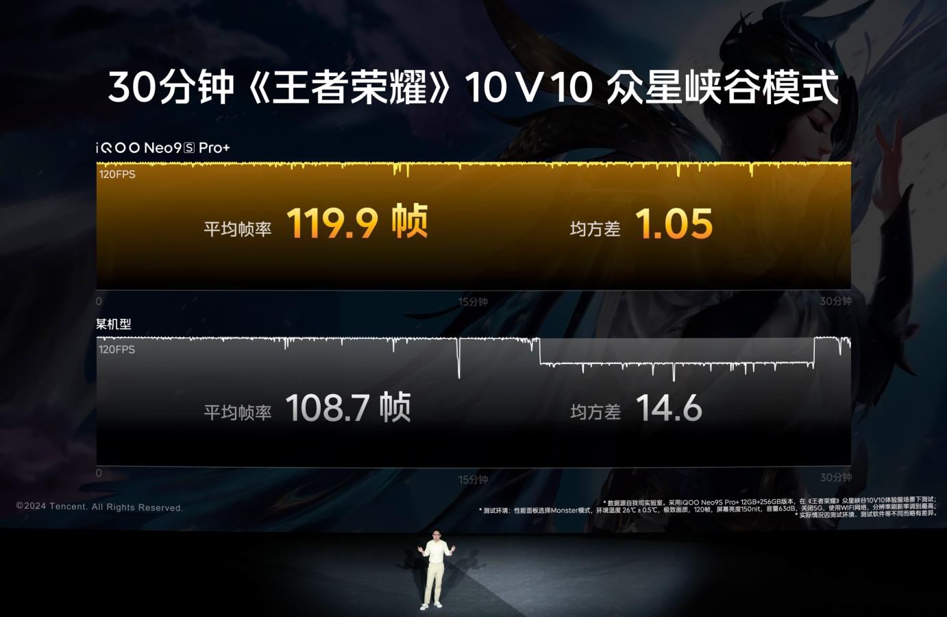 在《王者榮耀》眾星峽谷10V10超重載玩法和35℃高溫下玩《王者榮耀》120幀高清模式的測試中,iQOO Neo9S Pro+展現出了驚人的性能。半小時游戲平均幀率接近滿幀,且幀率穩如直線,足以證明其在手機游戲性能賽道上的霸主地位。
