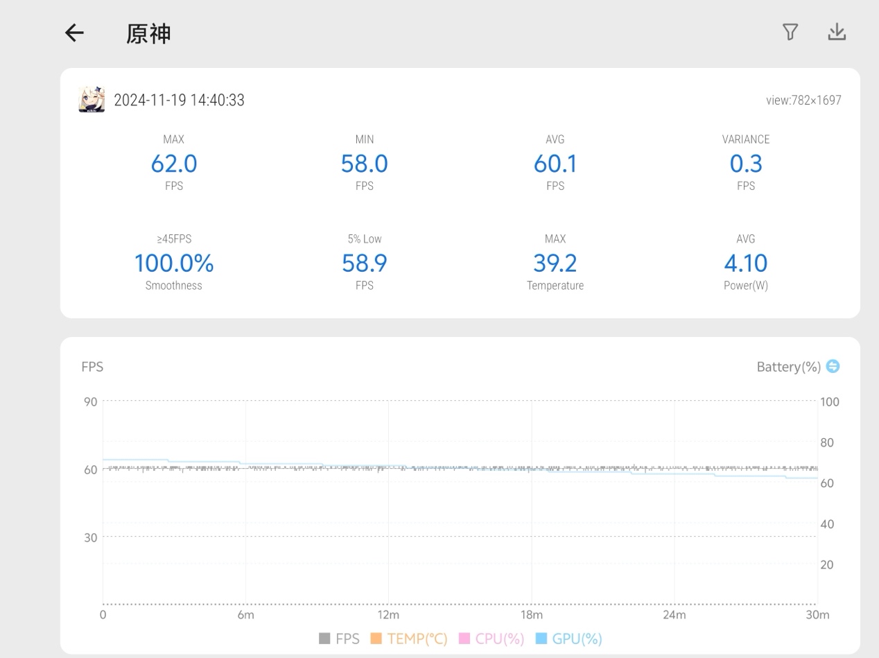 而在更高負載的《原神》測試環節,先將游戲內畫面設置調為“極高”,再手動將幀率調整到60FPS的模式,vivo X100 Pro在30分鐘的游戲過程中,平均幀率維持在了60.1FPS,且幀率全程表現穩定。