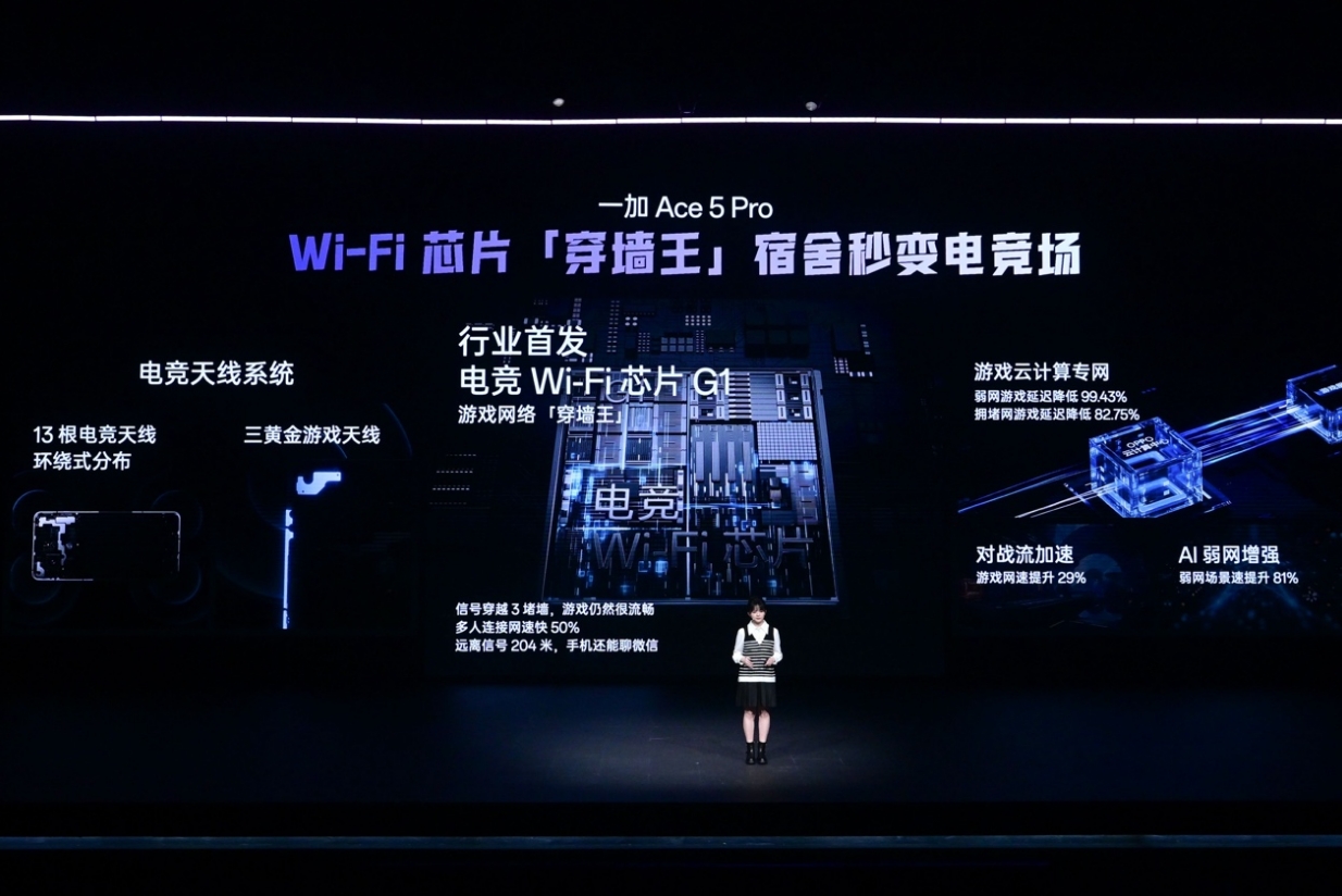 一加 Ace 5 Pro 首發(fā)搭載行業(yè)首個專門為手機游戲網(wǎng)絡定制的芯片——電競 Wi-Fi 芯片 G1。在連接同個路由器的情況下,一加 Ace 5 Pro 網(wǎng)速對比沒有 Wi-Fi 芯片的同平臺機型高 50%,徹底告別游戲中的網(wǎng)絡延遲和卡頓。同時,電競 Wi-Fi 芯片 G1 還擁有超遠的信號連接能力和穿透能力。在信號穿墻場景下,網(wǎng)絡時延相比無 Wi-Fi 芯片的同平臺機型降低 30.2%。即使穿透 3 堵墻、超過 200 米,一加 Ace 5 Pro 也始終保持穩(wěn)定通信,堪稱 Wi-Fi 信號「穿墻王」。此外,一加 Ace 5 Pro 還采用 13 根電競天線環(huán)繞式分布的天線設計,支持「對戰(zhàn)流加速」、「AI 弱網(wǎng)增強」以及「游戲云計算專網(wǎng)」技術,即使在學生宿舍或弱網(wǎng)情況下,一加 Ace 5 系列也能保持賽場級流暢。