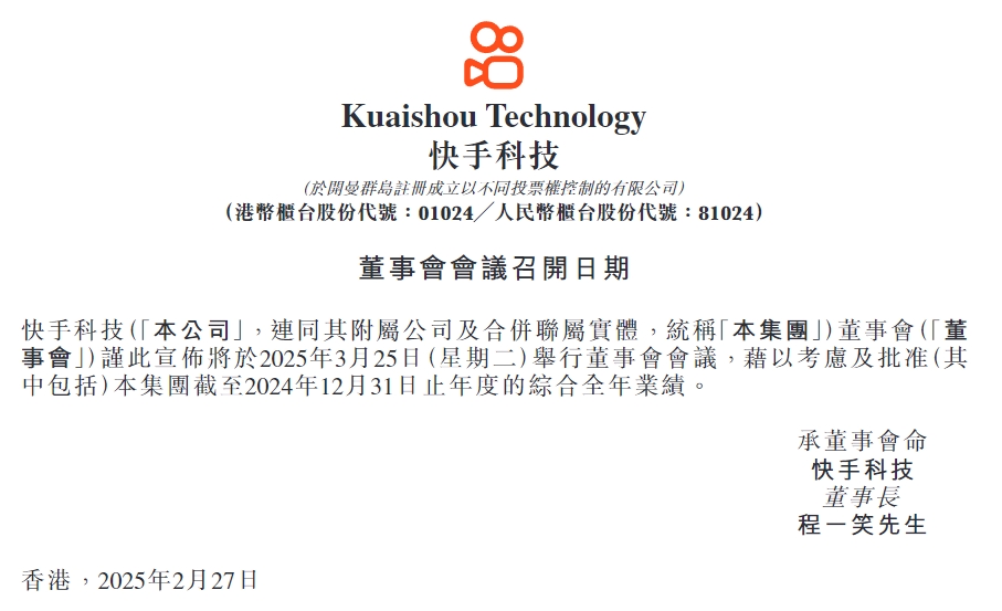 速途網訊 2025 年 2 月 27 日,快手科技發布公告,宣布董事會將于 2025 年 3 月 25 日(星期二)召開會議,會議的核心議程是審議及批準集團截至 2024 年 12 月 31 日止年度的綜合全年業績。