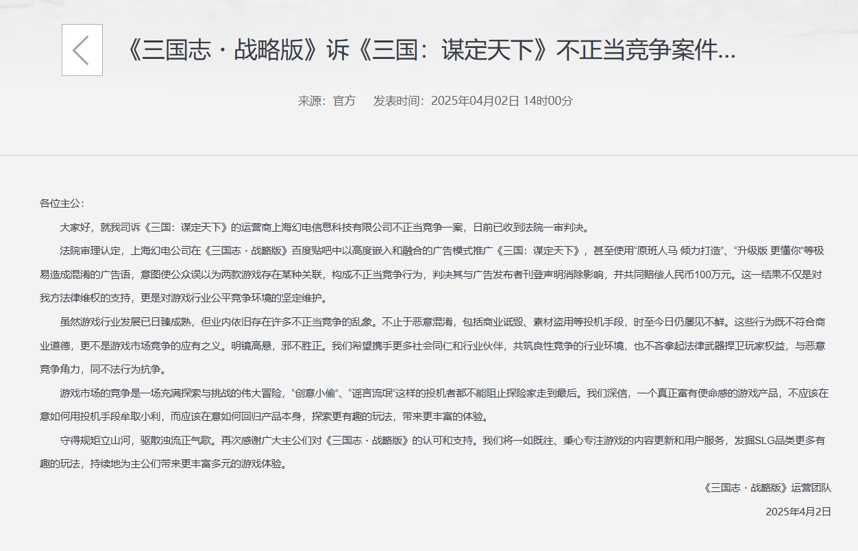 上周,靈犀互娛《三國志?戰略版》在其官網發布,訴《三國:謀定天下》的運營商上海幻電信息科技有限公司(以下簡稱B站)不正當競爭一案收到法院一審判決,也是引起了行業的關注。
