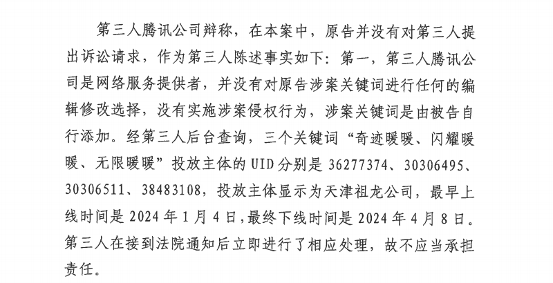 大概的意思就是,騰訊公司沒有對涉案關鍵詞進行任何編輯修改選擇,三個關鍵詞“奇跡暖暖” “閃耀暖暖”“無限暖暖”,顯示是天津祖龍公司自行添加。最早上線時間是2024年1月4日,最終下線時間是2024年4月8日。