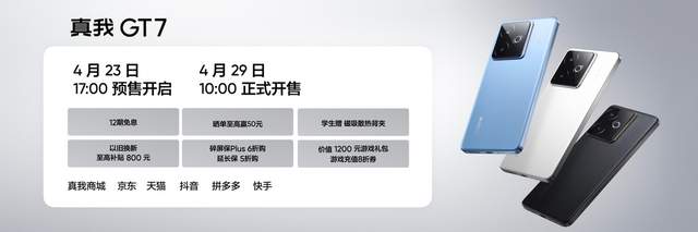 真我GT7現已正式開啟預售,4月29日10點全渠道現貨開售,價保618。購機可享至高12期免息分期,換新補貼最高800元,老用戶以舊換新至高享200元額外補貼。