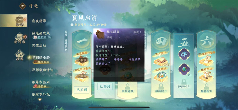 逆水寒民俗季版本中,通過探索戲曲主題副本、秘境榮譽挑戰還能獲得兩套絕美時裝。五一期間開放的“夏風啟清”,簽到第一天就送了坐騎“橘豆豚豚”。