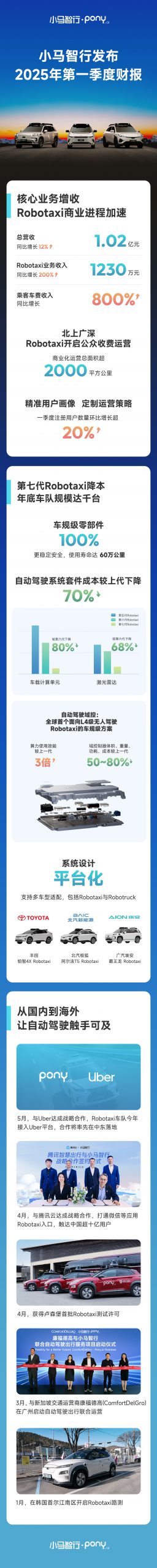 速途網(wǎng)5月20日消息(報道:李楠)今日,自動駕駛企業(yè)小馬智行(NASDAQ:PONY)發(fā)布未經(jīng)審計的2025年第一季度財報。財報顯示,小馬智行第一季度總營收為1.02億元(1398萬美元),同比增長12%;其中Robotaxi業(yè)務收入達1230萬元(173萬美元),同比增長200%。截至一季度末,現(xiàn)金等價物及長短期理財投資總額為53.59億元(7.39億美元)。