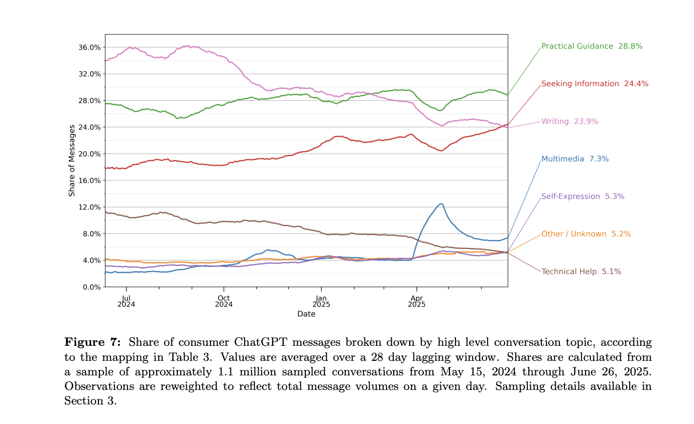 長期以來,經濟學家與行業分析師對生成式AI的關注,幾乎完全聚焦于其對有償工作的生產力影響。然而,該報告最核心的發現,恰恰是對這一主流敘事的有力重塑。數據顯示,截至2025年6月,非工作相關的消息已經從一年前的53%飆升至73%,占據了絕對主導地位。這意味著,在ChatGPT每天處理的超過25億條信息中,絕大多數都與人們的家庭生產、個人學習、生活決策和興趣探索息息相關。
