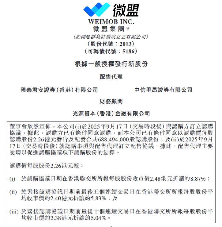 速途網2025年9月18日訊(報道:龍翔),微盟集團(股票代碼:2013.HK)發布公告稱,公司擬以每股2.26港元的價格發行合共6.88494億股認購股份,預計募資總額約15.56億港元,所得款項凈額約15.5529億港元,將主要用于AI技術整合、精準營銷拓展、海外業務布局及補充營運資金,以強化技術優勢與市場領導地位。據悉此次配售由國際長線投資機構無極資本Infini Capital全額認購。