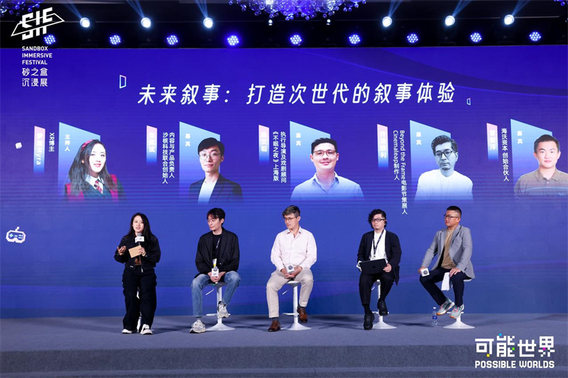 在上午的多人對話環節,XR博主夢雅Myra作為主持人,與CinemaLeap制作人、Beyond the Frame電影節策展人待場勝利,沙核科技聯合創始人、內容與產品負責人張佩斌,《不眠之夜》上海版執行導演及戲劇顧問陳文聰、海沃資本創始合伙人曾俊洋四位嘉賓(作為待場勝利的中日翻譯),以「未來敘事:打造次世代的敘事體驗」為題展開了深入的探討。