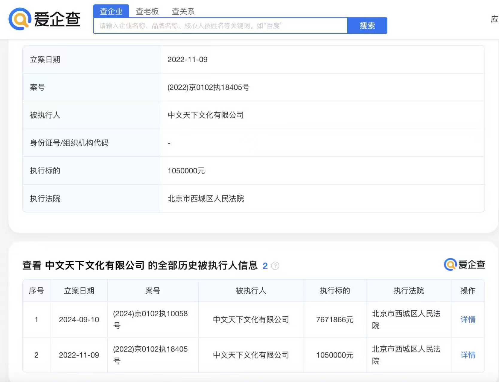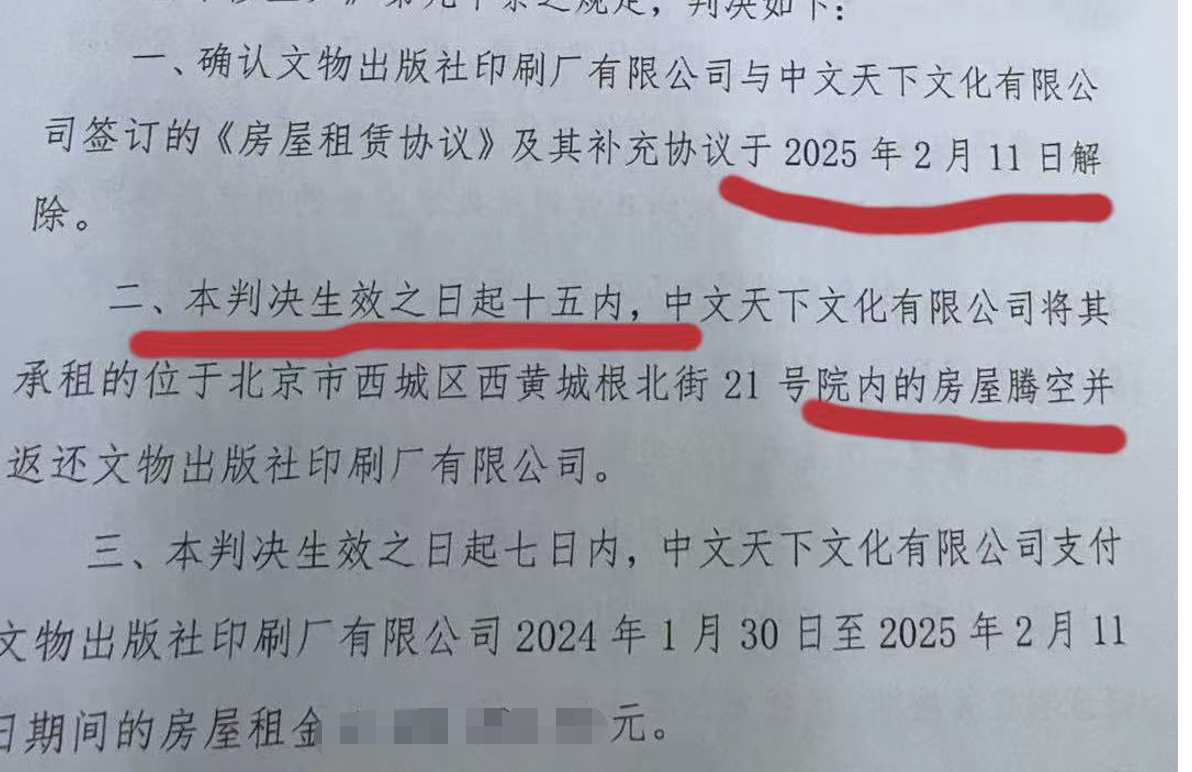 根據(jù)企查查顯示,僅西城區(qū)法院判決需追回的房租標(biāo)的額近900萬(wàn),并且法院已經(jīng)判決產(chǎn)權(quán)方文物印刷廠和中文天下于2025年2月11日合同解約,并要求15天內(nèi)搬離,并于本月再次法院判決書已出要求執(zhí)行。