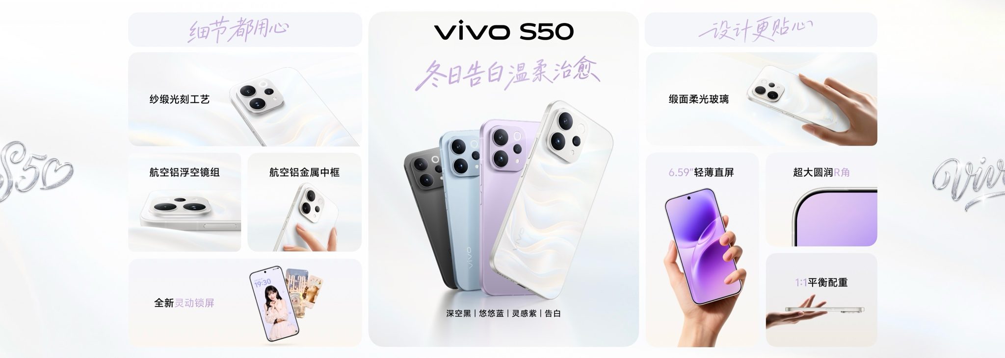 全新的 vivo S50系列以色彩與工藝,進(jìn)一步詮釋“我喜歡我,每秒都生動(dòng)”的態(tài)度。S50系列帶來全新「告白」配色,在緞面柔光玻璃背板上引入全新紗緞光刻工藝,呈現(xiàn)白里透金的細(xì)膩光澤,觀感更柔和、觸感更溫潤(rùn)且不易沾染指紋,如冬日暖陽(yáng)般溫柔治愈。仿佛將一份觸手可及的溫柔握在掌心,提醒我們?cè)诩姺笔澜缰?,依然可以留出一份溫柔,去擁抱那個(gè)獨(dú)一無(wú)二的自己。在「告白」之外,vivo S50 還提供靈感紫、悠悠藍(lán)、深空黑三種配色,vivo S50 Pro mini 精選告白、靈感紫、深空黑三款配色,覆蓋從治愈浪漫到沉穩(wěn)內(nèi)斂的多彩選擇。